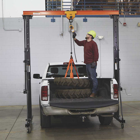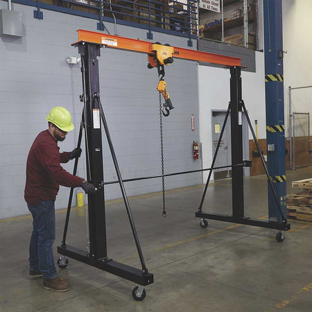 The Bannon Adjustable Gantry Crane is an all-steel telescoping unit that allows one operator to hoist heavy items easily. Designed for use with a trolley hoist (not included) this crane features an I beam that adjusts from 99-1/2 in. to 147-1/2 in. H with 9 positive stops to provide a sturdy overhead lift point for lifting car engines, heavy machinery and other equipment.