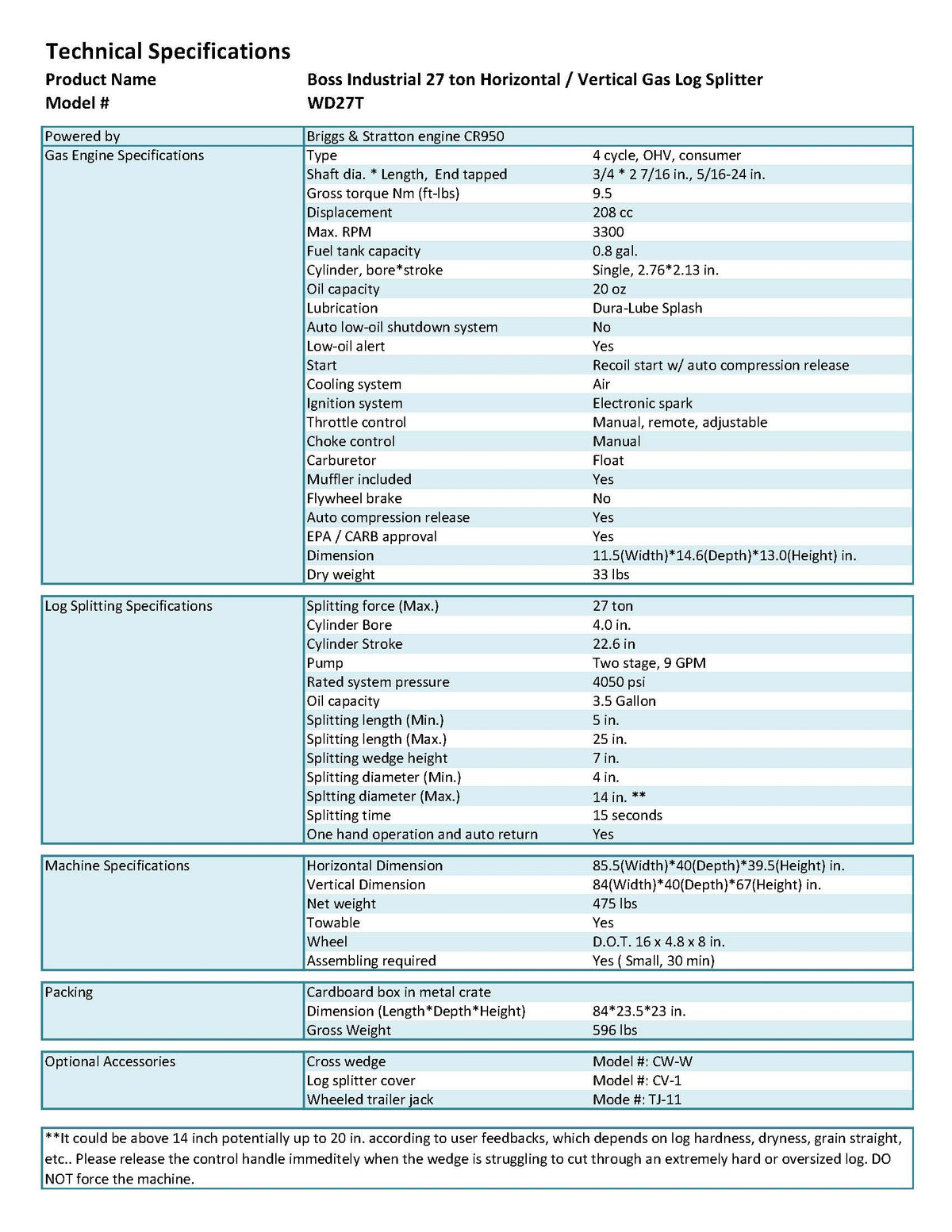 This Boss Industrial Professional 27 Ton Horizontal / Vertical Gas Log Splitter includes a 7 inch wedge, which when combined with their 27 Ton hydraulic system makes easy work of any log.