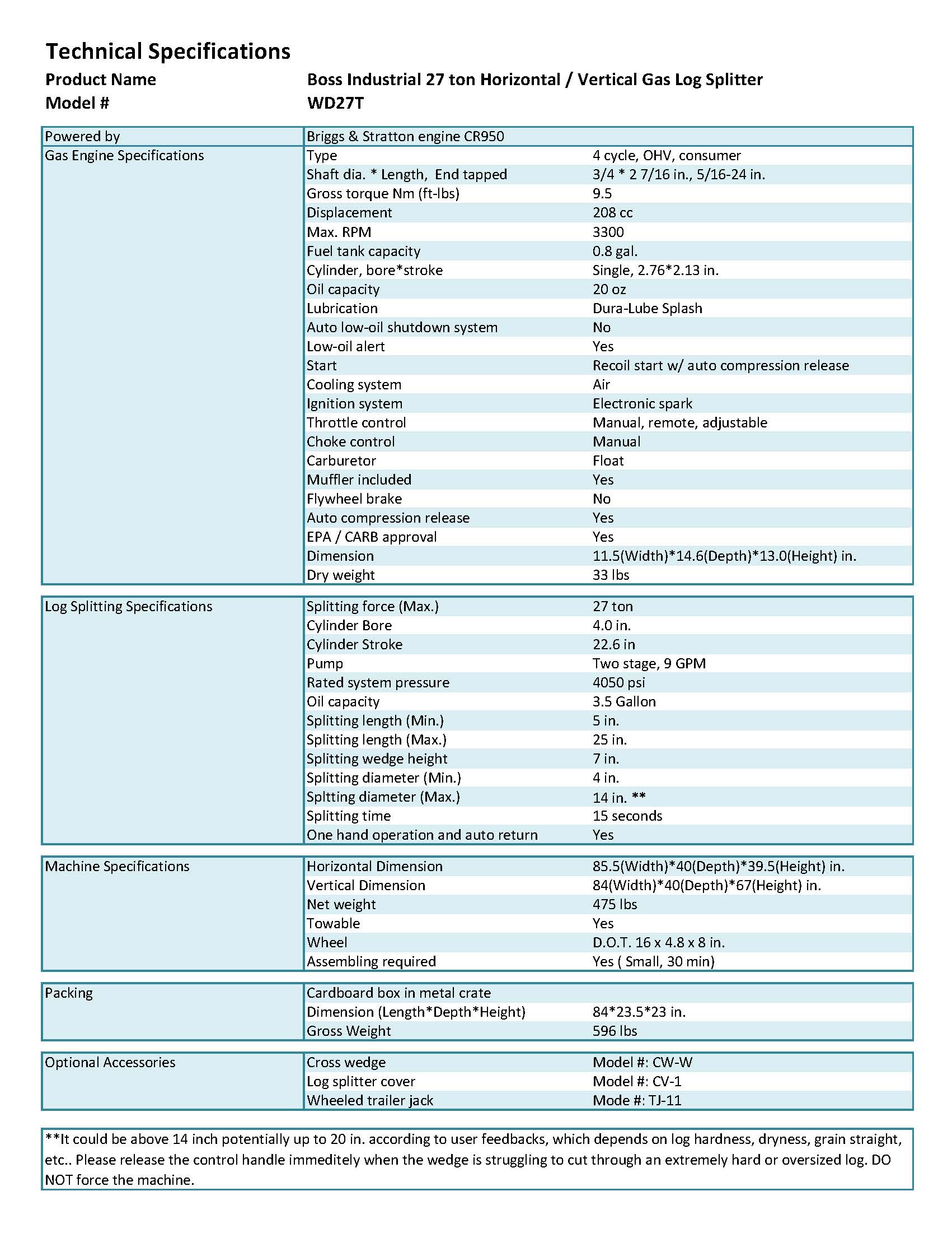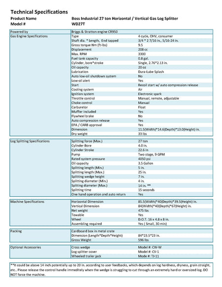 With the Boss Industrial Professional 27 Ton Horizontal / Vertical Gas Log Splitter, you will split wood like a pro and keep your fireplace full all winter. Better still, Boss stands by its excellent product quality with a 2 year warranty including hydraulics!