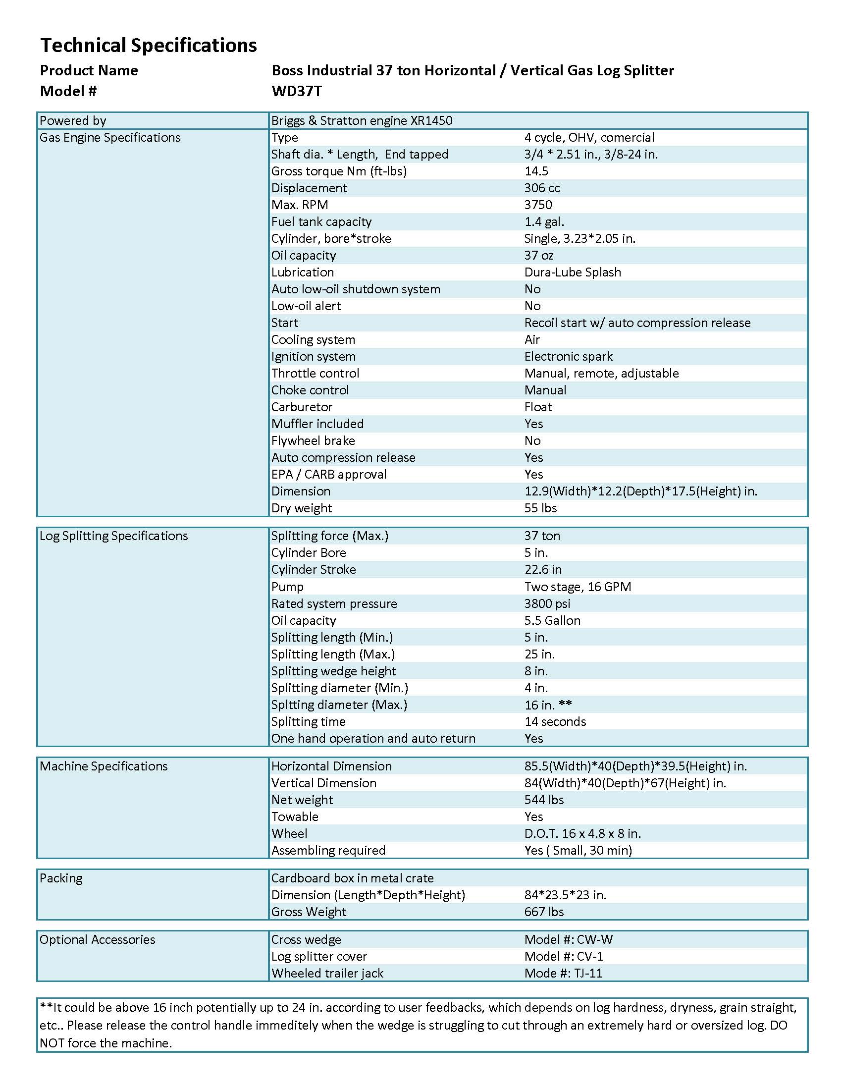 With the Boss Industrial Professional 37 Ton Horizontal / Vertical Gas Log Splitter, you will split wood like a pro and keep your fireplace full all winter. Better still, Boss stands by its excellent product quality with a 2 year warranty including hydraulics!