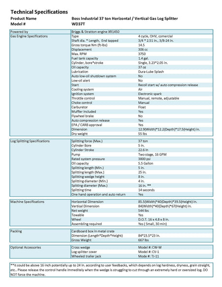 Boss Industrial 37-Ton Horizontal/Vertical Gas Log Splitter (WD37T)