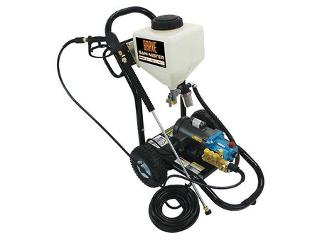 Providing complete coverage for floors, walls, tables and equipment for your business, the Sani-Mister also features an easy to measure tank, flushing valve for cleanup, heavy-duty tubular frame, and pneumatic wheels.