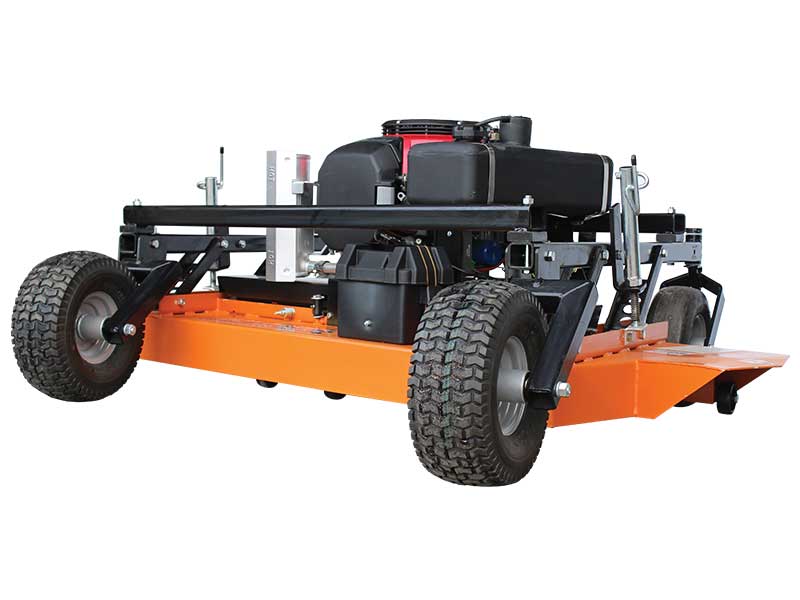 The tow bar features a hitch pin connection, making it ideal for use with an ATV or UTV and all four pneumatic tires are flat free. It has a two point height adjustment, which makes adjusting height quick and easy, cuts a wide 60" path and can be set at 1.5" to 5" mow height.