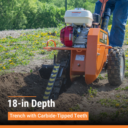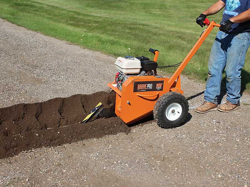 The Brave Pro 18-in. trencher is used for digging through compacted gravel and soils to install electric wires, gas lines, water lines, and more. A reliable Honda engine powers the BRPT18 and is compact enough to fit through most gates and doorways, making it easy to transport from job to job. The max 18-in. depth and 3-in. trench width dig deep enough for laid pipes and wires to remain safe underground.