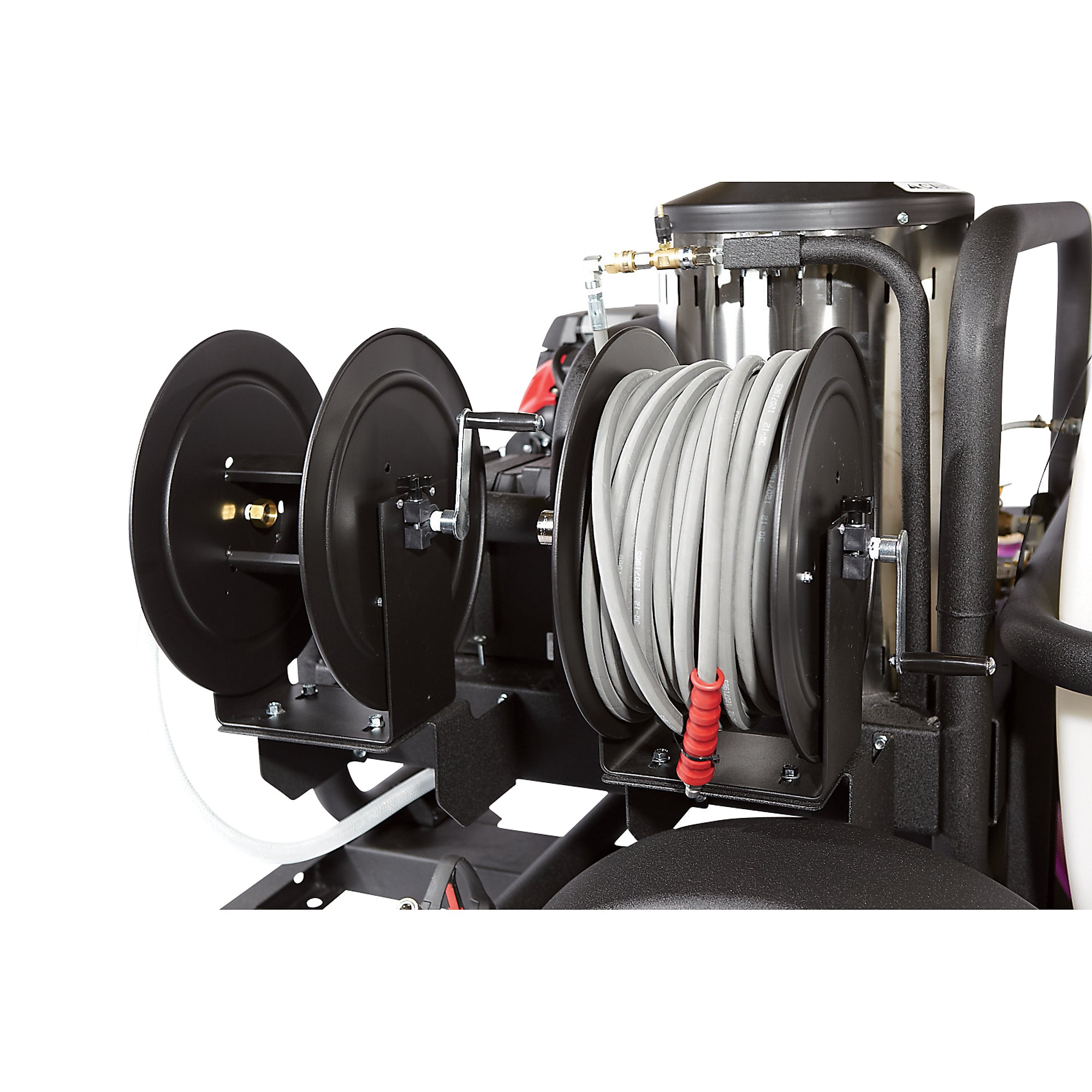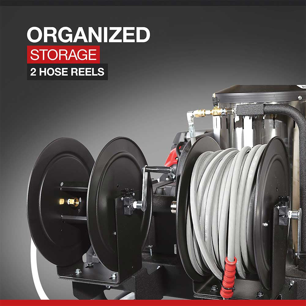 🌀 100ft. Nonmarking High-Pressure Hose – Includes 2 hose reels (garden hose + pressure hose).