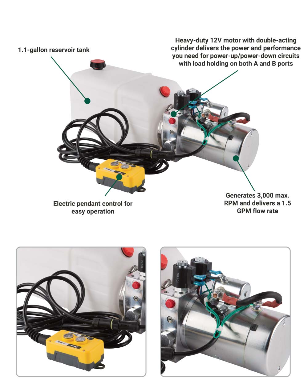 - Heavy-duty 12V motor with double-acting cylinder delivers the power and performance you need for power-up/power-down circuits with load holding on both A and B ports