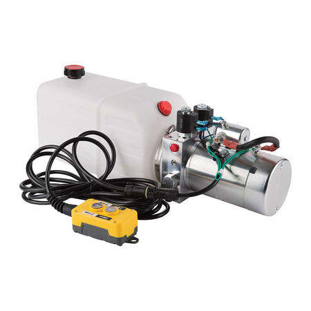 The NorTrac dump trailer power unit with 12V DC motor operates a double-acting cylinder for power-up/power-down circuits with load holding on both A and B ports. This 2 HP power unit is ideal for dump truck/trailer or tipper applications.