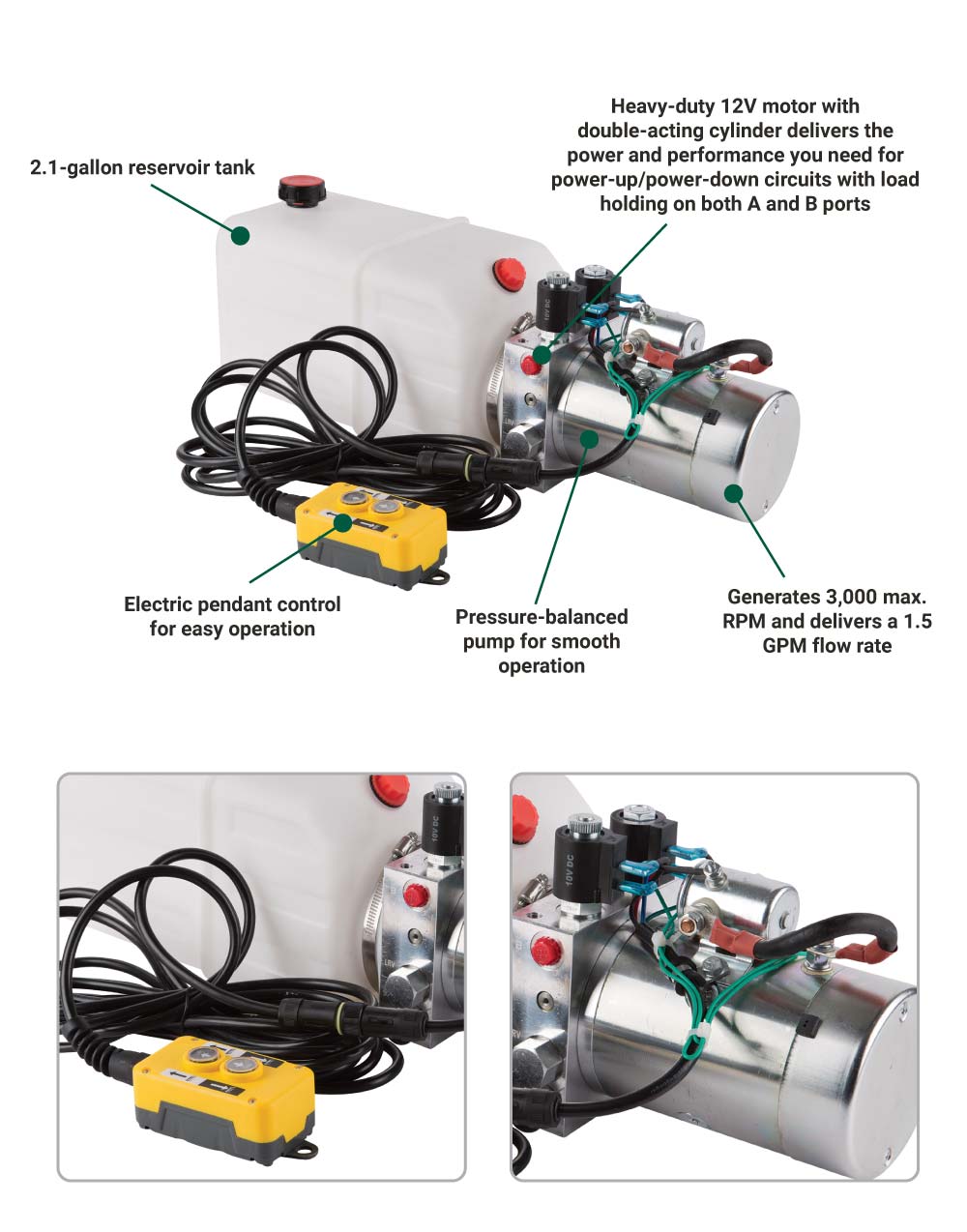 - Heavy-duty 12V motor with double-acting cylinder delivers the power and performance you need for power-up/power-down circuits with load holding on both A and B ports