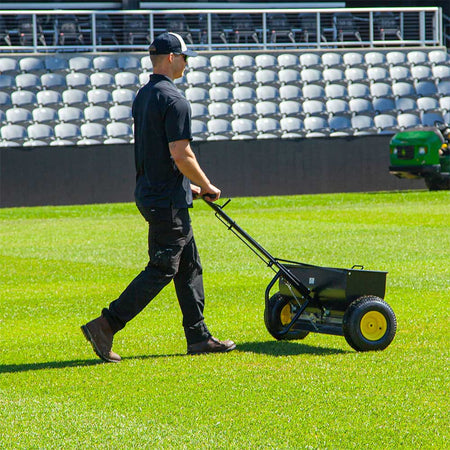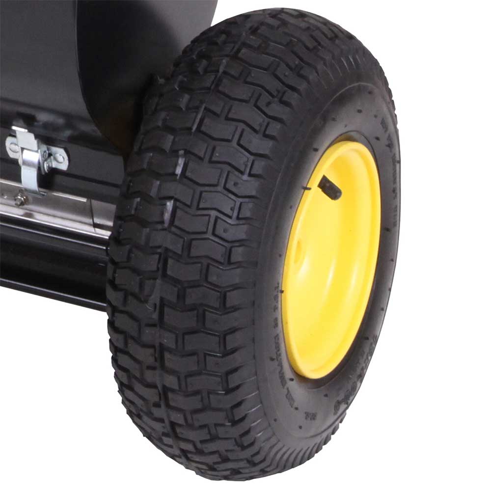 The 13" x 5" pneumatic tires provide excellent traction and distribute weight evenly, ensuring a smooth, uniform spread without leaving tracks on the lawn.