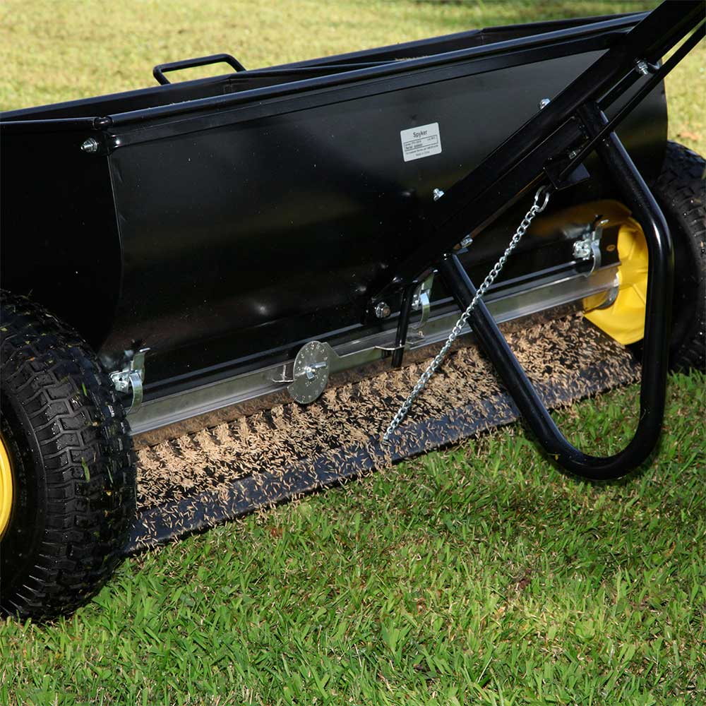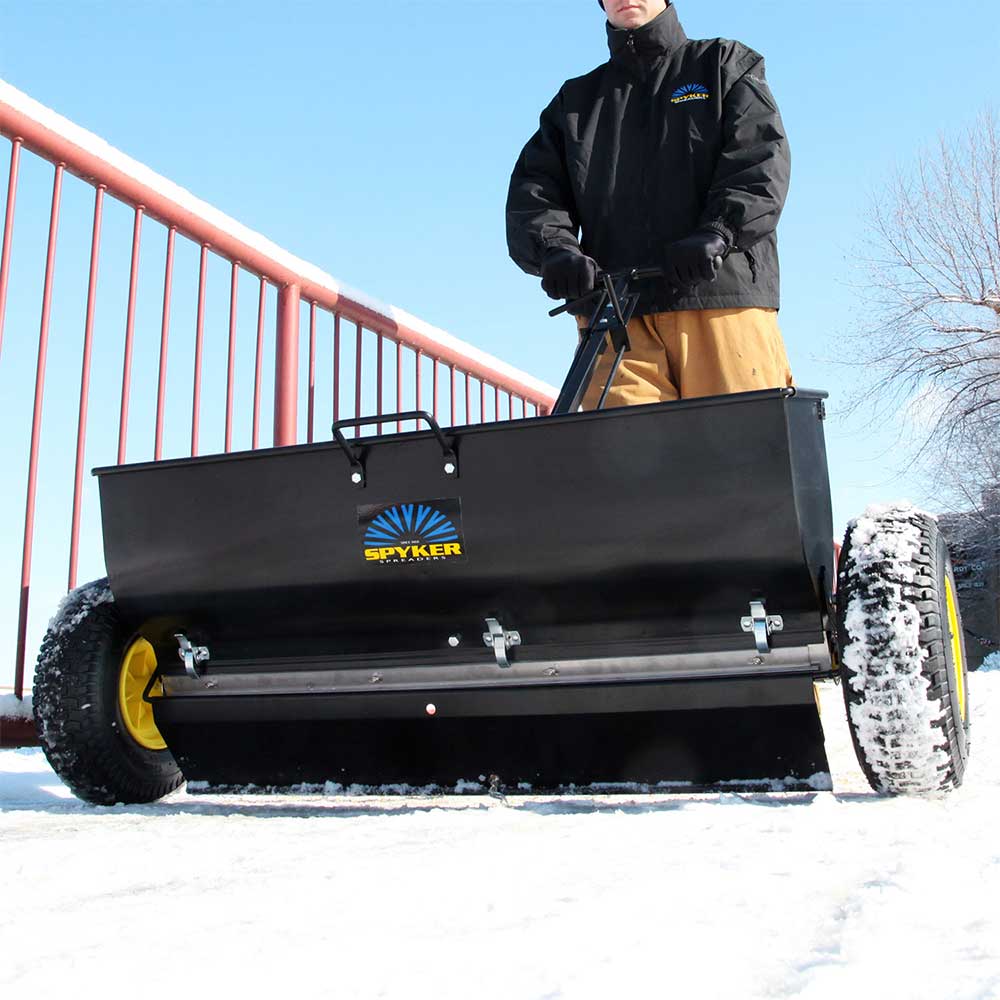 The Spyker Commercial Drop Spreader Model P70-12010 is designed for year-round precision, whether distributing ice melt in winter or applying fertilizer in spring.