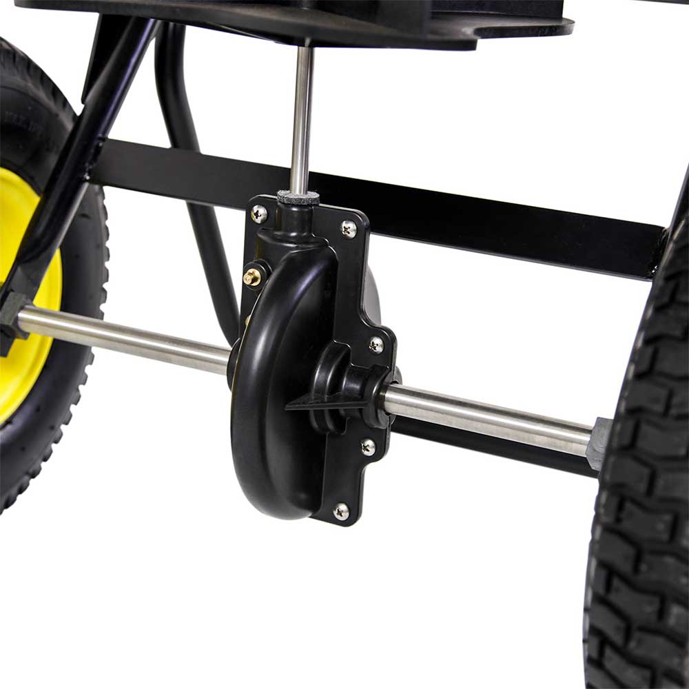 - Large, pneumatic tires minimize fatigue, increase traction, and protect grass from damage